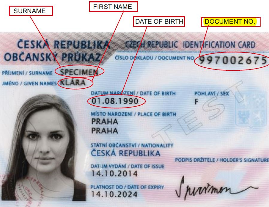 Τα ταυτοποιητικά έγγραφα του Τσέχου πολίτη είναι η Κάρτα Πολίτη και το Διαβατήριο, τα οποία φέρουν ως αναγνωριστικό ασθενή τον αναγραφόμενο στη θέση "DOCUMENT NO" αριθμό.
